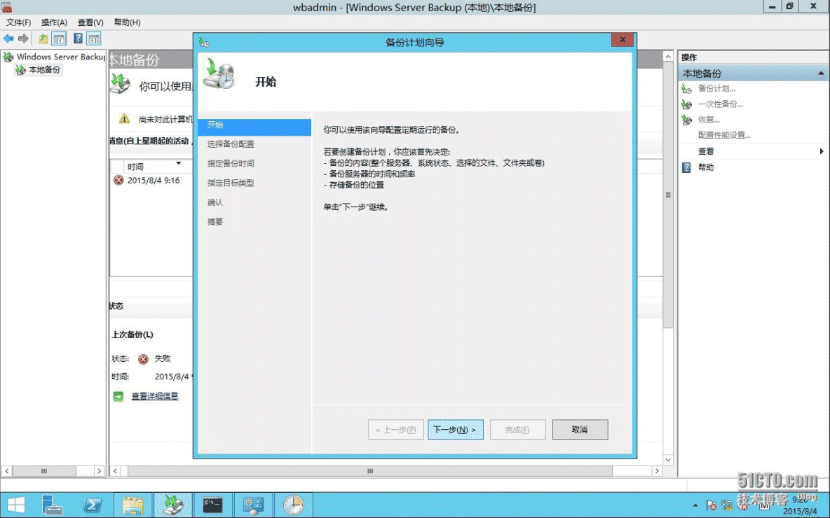 2、啟動Windows Server Backup,在“本地備份”選擇“備份計劃向導”,啟動向導后,選擇“下一步”。