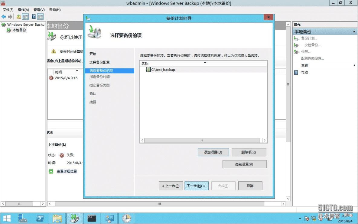 4、選擇“添加項目”,選“test_backup”,確認后,選“下一步”。(測試中使用c:\test_backup)