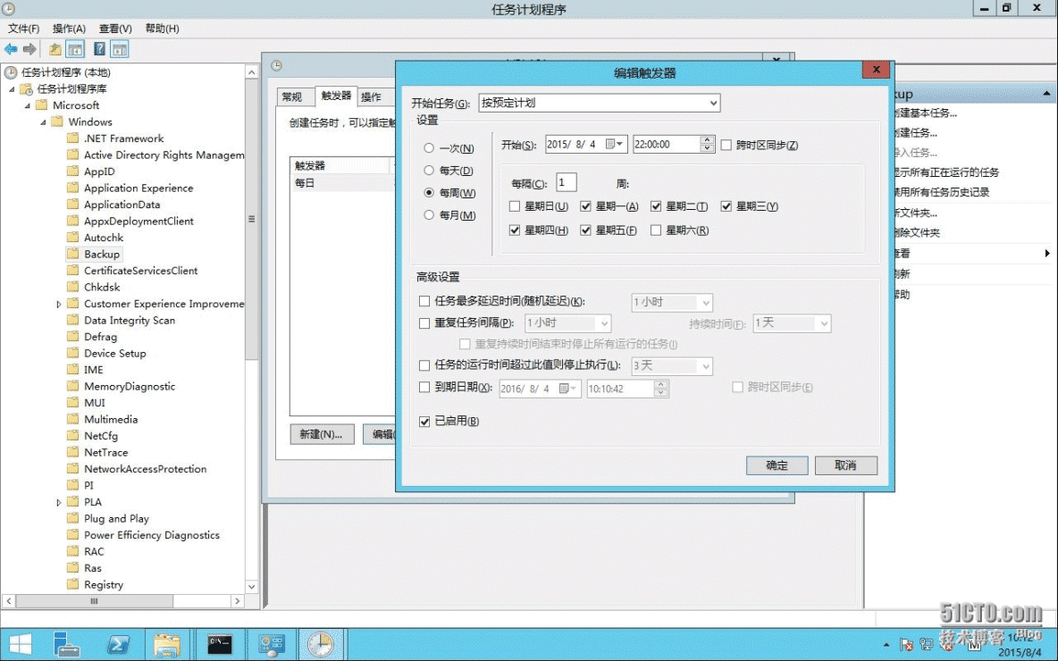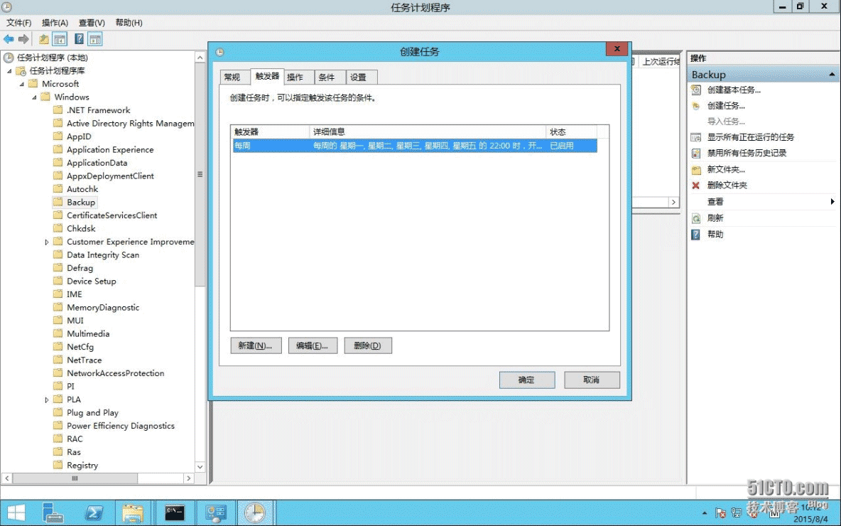 12、右鍵備份任務計劃,選“屬性”—“觸發器”—選“編輯”,可以在編輯觸發器界面,更改備份周期,現更改為每周,星期一到五 22:00:00開始備份。(每日備份是指工作日,所以是從周一到周五)