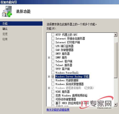 1、安裝Windows Server BackupWindows Server Backup工具已經(jīng)包含在所有版本的Windows Server 2008中,但默認(rèn)狀態(tài)下它并沒有被安裝。要安裝Windows Server Backup工具,我們可通過服務(wù)器管理器來完成。在服務(wù)器管理器中從左側(cè)窗格選擇“功能”節(jié)點,然后單擊右側(cè)的“添加功能”鏈接,隨后會打開“添加功能向?qū)?rdquo;。在“選擇功能”界面中,選擇“Windows Server Backup”(建議同時選擇Windows Recovery Disc,該工具是還原工具)。在選擇Windows Server Backup功能時,Windows Server Backup和命令行工具選項都將被選中。單擊“下一步”,然后單擊“安裝”按鈕。在向?qū)О惭b完這些功能后,單擊“關(guān)閉”按鈕即可。至此,Windows Server Backup功能就成了管理工具鋼菜單下的一個選項,同時在“所有程序”→“維護(hù)”菜單下還將能看到“創(chuàng)建恢復(fù)盤”選項。(圖1)