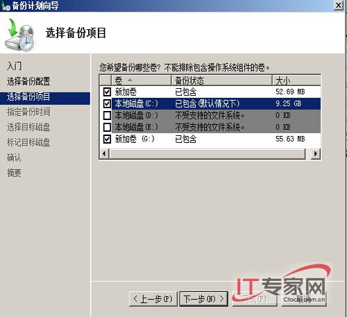 運行Windows Server Backup工具,在其窗口的操作窗格或“操作”菜單中單擊“備份計劃”就會啟動備份計劃向?qū)АT趻呙柰晁锌捎么疟P后,Windows Server Backup會啟動備份計劃向?qū)В瑔螕?ldquo;下一步”。在“選擇備份配置”界面中需要注意“整個服務(wù)器”單選按鈕下列出的備份大小,這時用于備份服務(wù)器數(shù)據(jù)、應(yīng)用程序已經(jīng)系統(tǒng)狀態(tài)所需要的存儲空間的大小。如果希望備份服務(wù)器上所有的卷,選擇“整個服務(wù)器”單選按鈕即可。如果要備份服務(wù)器上特定的卷,選中“自定義”單選按鈕,單擊“下一步”進(jìn)入設(shè)置界面。此時會在“選擇備份項目”界面中顯示當(dāng)前服務(wù)器所有的卷,在此我們選擇需要備份卷,并反選不需要備份的卷對于的選項。需要注意的是,只有NTFS格式的分區(qū)才會顯示出來,同時包含了引導(dǎo)文件、操作系統(tǒng)文件或應(yīng)用程序的卷默認(rèn)會被選中,并且不可取消。(圖3)