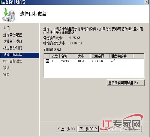 依據(jù)向?qū)нM(jìn)入“選擇目標(biāo)磁盤”界面,在此我們設(shè)置保存?zhèn)浞莸耐獠看疟P。如果要使用的磁盤沒有列出,需單擊“顯示所有可用磁盤”按鈕,隨后選中復(fù)選框,選中每個希望用于保存?zhèn)浞莸拇疟P。需要說明的是,每個外部磁盤最多可以包含512個備份,主要取決于每個備份中包含的數(shù)據(jù)數(shù)量。同時在這里還可以選擇多個磁盤,這樣的話,Windows Server Backup會自動輪換使用目標(biāo)磁盤進(jìn)行備份。單擊“下一步”后,還彈出一個警告對話框,警告我們所選磁盤將會被格式化,現(xiàn)有的數(shù)據(jù)都會被刪除,我們單擊“是”即可。(圖5)