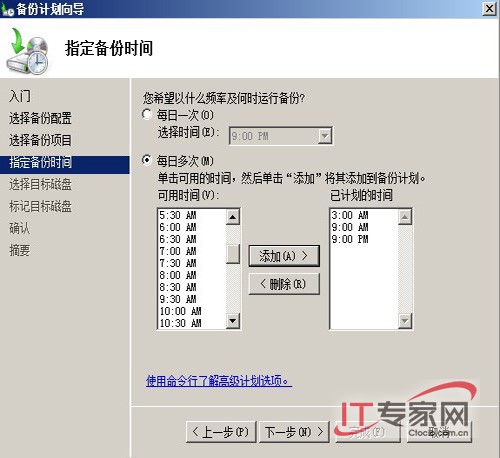 依據(jù)向?qū)нM(jìn)入“指定備份時間”界面,在此我們可以決定備份的頻率和備份的時間。如果希望在每天的特定時間執(zhí)行備份,需選中“每日一次”單選按鈕,然后選擇每天進(jìn)行備份的開始時間。如果希望每臺執(zhí)行多出備份,需選中“每日多此”單選按鈕,然后從“可用時間”列表框中選擇一個開始時間,并單擊“添加”按鈕將其加入到“已計劃的時間”列表框中,對于每個希望添加的時間,重復(fù)上面的操作即可。(圖4)