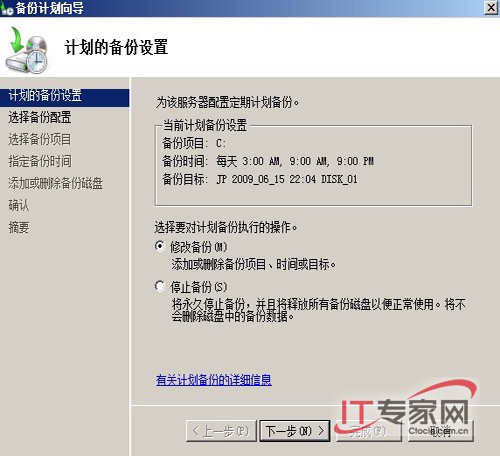 依據(jù)向?qū)нM(jìn)入“計劃的備份設(shè)置”界面,在該界面中有兩個單選按鈕,如果希望添加或刪除備份項目、時間或目標(biāo),只需選中“修改備份”單選按鈕。如果希望停止計劃備份的運行,單擊“停止備份”單選按鈕。需要說明的是,停止備份會將磁盤空間釋放以供常規(guī)使用,但存在其中的備份并不會被刪除,在進(jìn)行數(shù)據(jù)恢復(fù)時依然可以使用。最后,根據(jù)向?qū)瓿蓚浞萦媱澋膭?chuàng)建。(圖7)