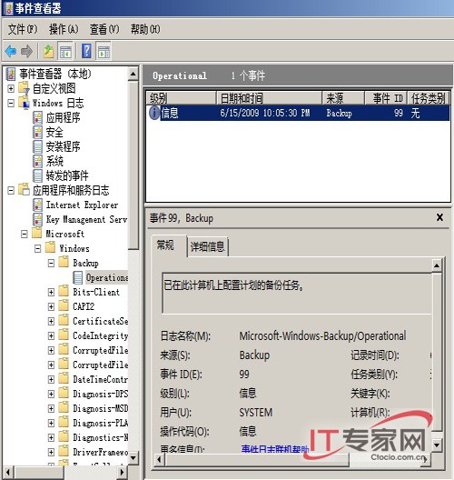 其二,不管什么時候執(zhí)行Windows Server Backup備份服務(wù),該程序都會將相關(guān)的事件寫入到Windows事件日志中。有關(guān)日志可以在“應(yīng)用程序和服務(wù)日志\Microsof\Windows\Backup\Operational”節(jié)點下看到。通過查看Operational日志,我們可以快速了解備份從什么時候開始,什么時候結(jié)束,已經(jīng)失敗的原因。例如是由其他管理員取消,或者是否是因為備份目標(biāo)上的可以空間不足。通過備份的開始時間和完成時間計算,我們還可以知道備份進(jìn)行了多長時間等等。(圖8)