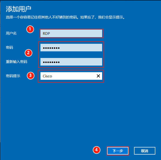 (2)輸入新用戶的用戶名、密碼及密碼提示,點擊【下一步】。