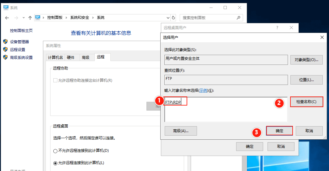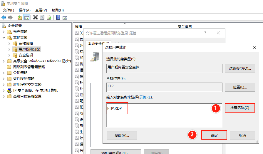 (3)在彈出的【選擇用戶】提示框下方輸入:RDP,然后點擊右側的【檢查名稱】,用戶檢查無誤后,最后點擊【確定】。