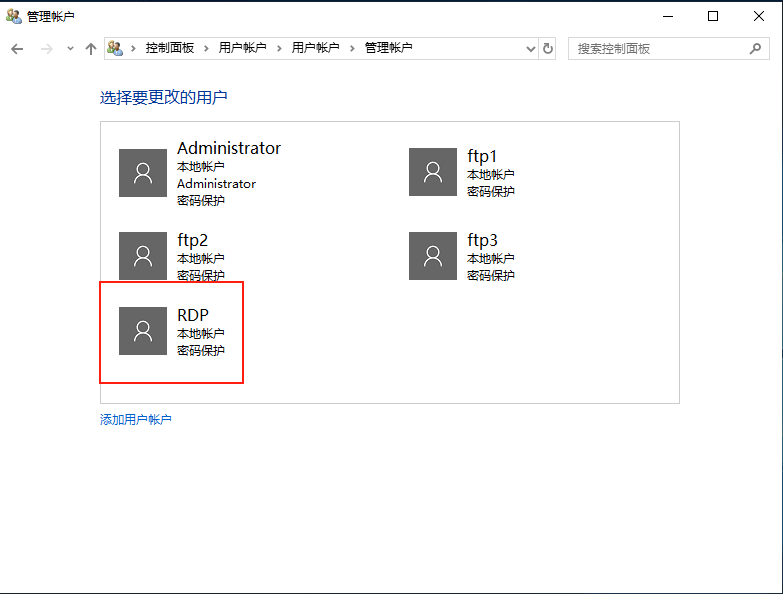 (4)返回【管理賬戶】頁面,可以看到新建的用戶RDP已經出現在用戶列表中。