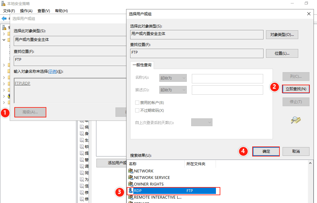 (4)進入【選擇用戶或組】對話框,點擊【高級】——>【立即查找】,在搜索結果中找到剛才創建的RDP用戶,選中,點擊【確定】。