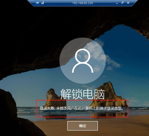 (5)進入遠程桌面窗口,但是提示:登錄失敗:為授予用戶在此計算機的請求登錄類型。說明 administrator 的遠程登錄權限禁用設置成功。