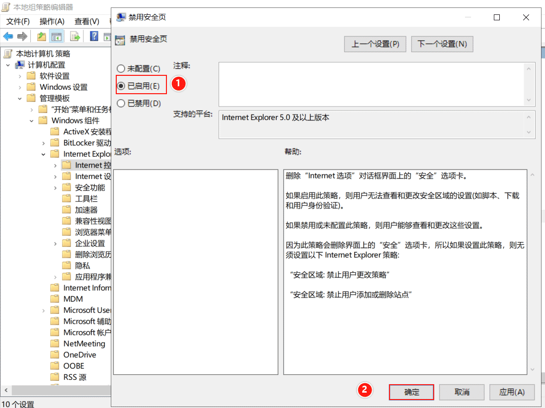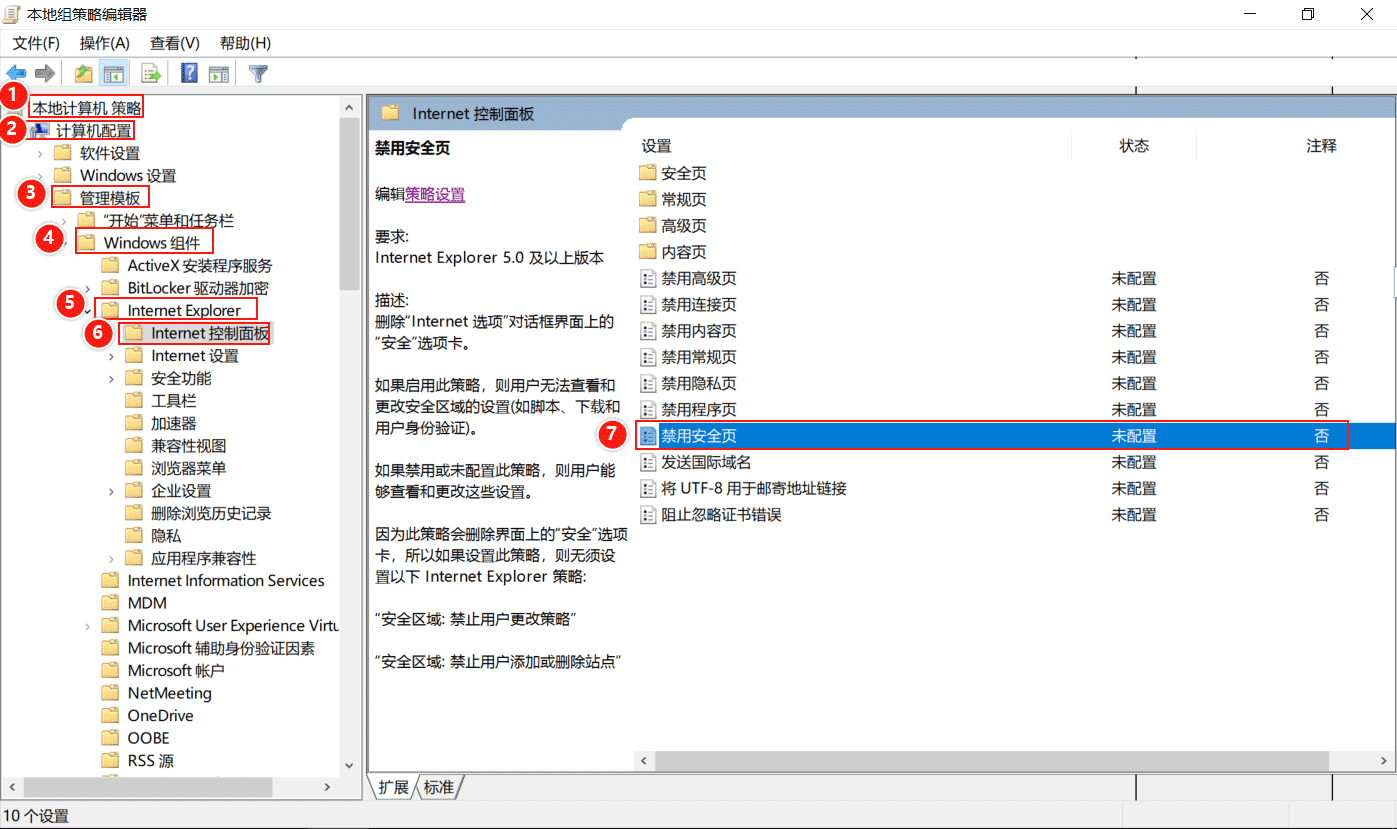 打開(kāi)本地組策略編輯器,依次展開(kāi)【本地計(jì)算機(jī)策略】——>【計(jì)算機(jī)配置】——>【管理模版】——>【W(wǎng)indows組件】——>【互聯(lián)網(wǎng) Explorer】——>【互聯(lián)網(wǎng)控制面板】,找到【禁用安全頁(yè)】,雙擊打開(kāi)。