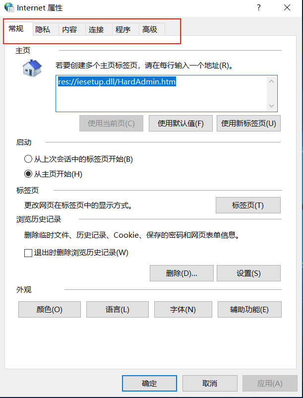 打開(kāi)【控制面板】——>【網(wǎng)絡(luò)和互聯(lián)網(wǎng)】,雙擊【互聯(lián)網(wǎng)選項(xiàng)】,彈出的【互聯(lián)網(wǎng)屬性】對(duì)話(huà)框中正常包 含【常規(guī)】,【安全】,【隱私】、【內(nèi)容】,【連接】,【程序】,【高級(jí)】7個(gè)選項(xiàng)卡。