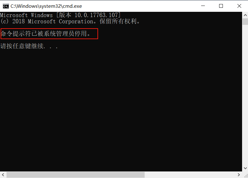 再次打開(kāi)cmd時(shí),cmd.exe 提示:命令提示符已被系統(tǒng)管理員停用。