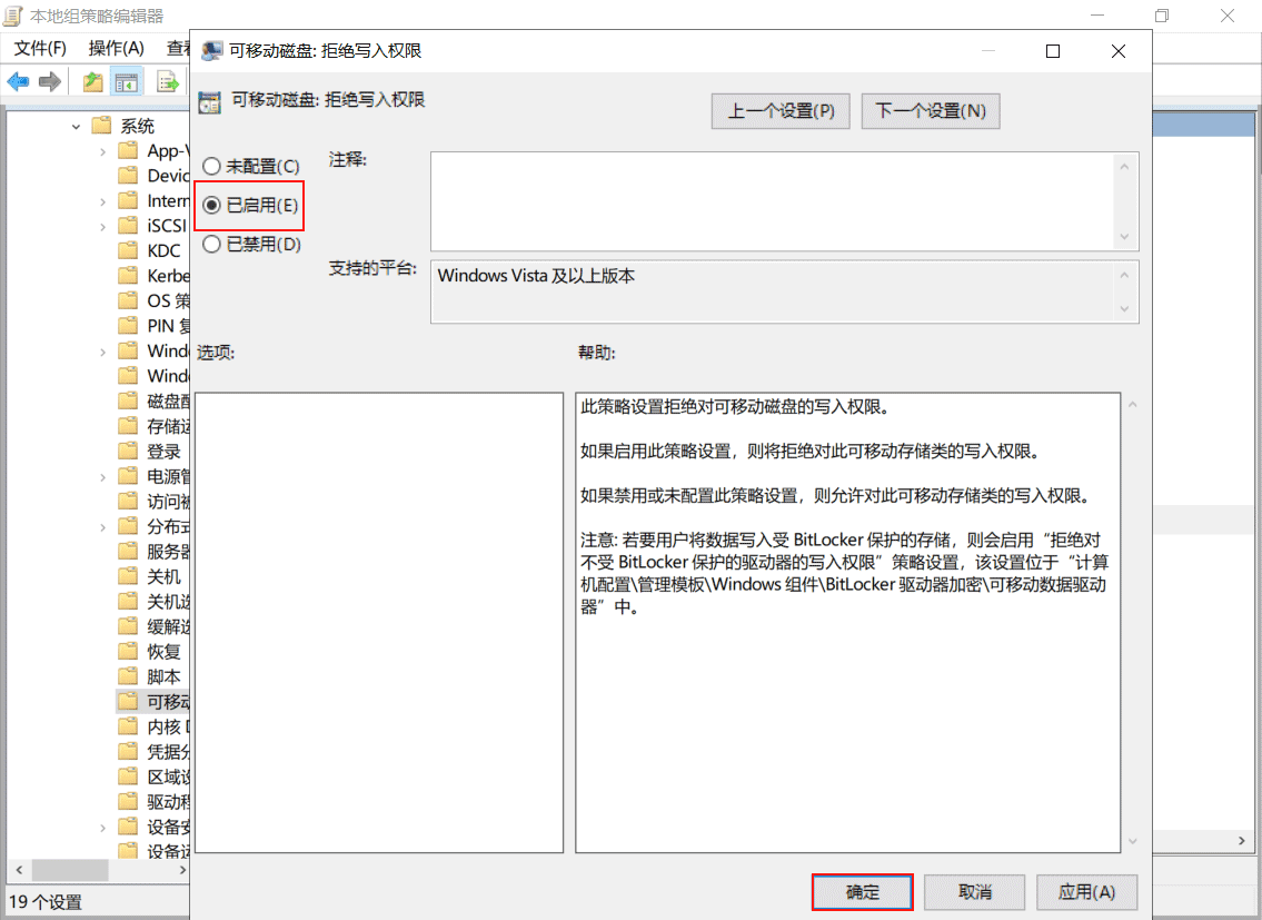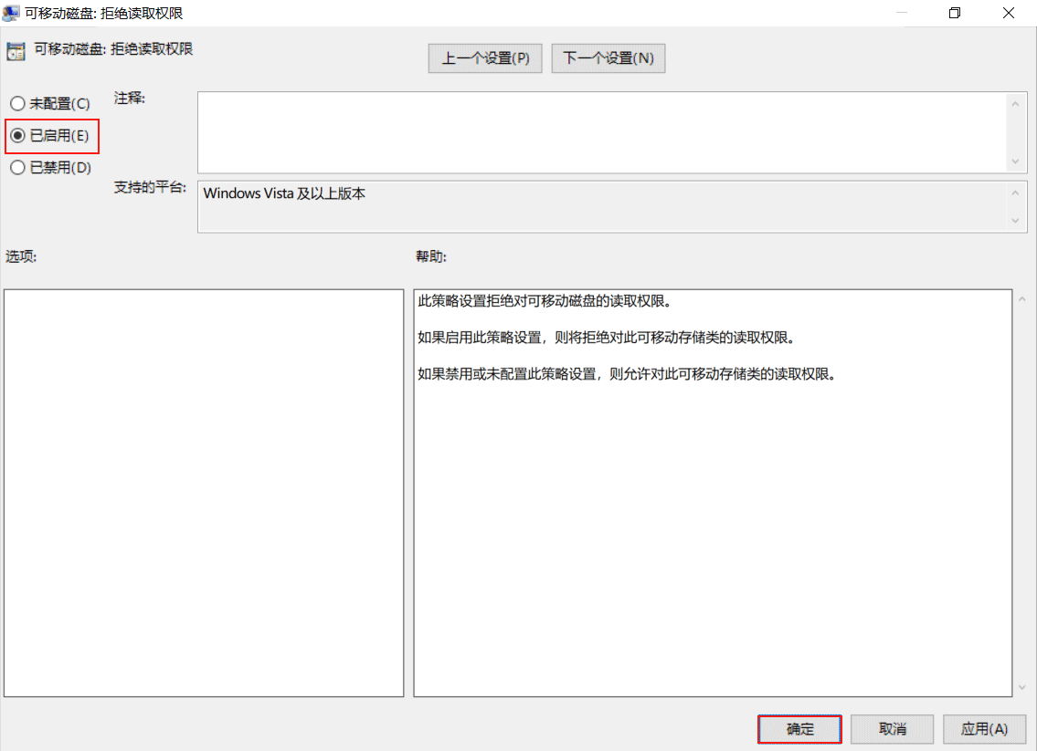 找到【可移動(dòng)磁盤(pán):拒絕讀取權(quán)限】,雙擊打開(kāi),選擇【已啟用】,點(diǎn)擊【確認(rèn)】。