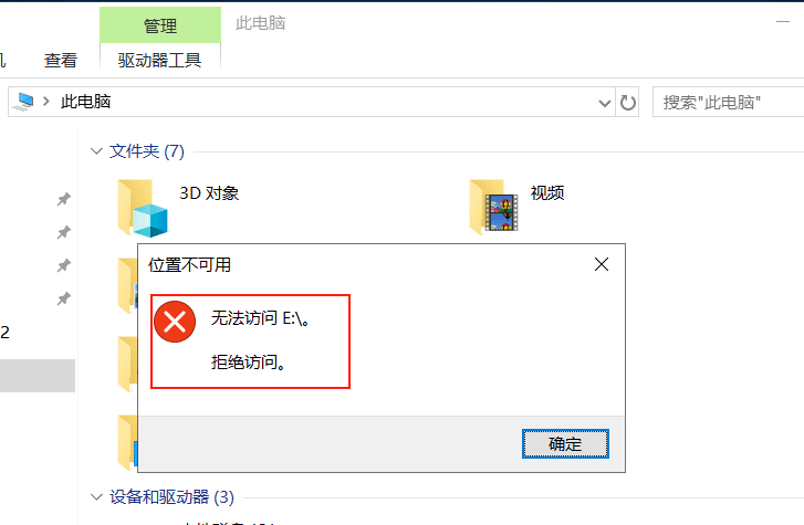 將可移動(dòng)硬盤(pán)連接到服務(wù)器中,雙擊可移動(dòng)硬盤(pán),系統(tǒng)彈出告警對(duì)話(huà)框:拒絕訪問(wèn)。