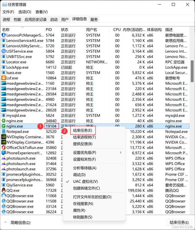 (從下圖中可以看到,當前我想使用的nginx.exe文件有兩條運行信息,一條是我們為了解除端口占用本來就應該結束的(19104),還有一條并沒有占用端口(34840),但是為了避免其他問題的產生,可以把另一條也結束掉)