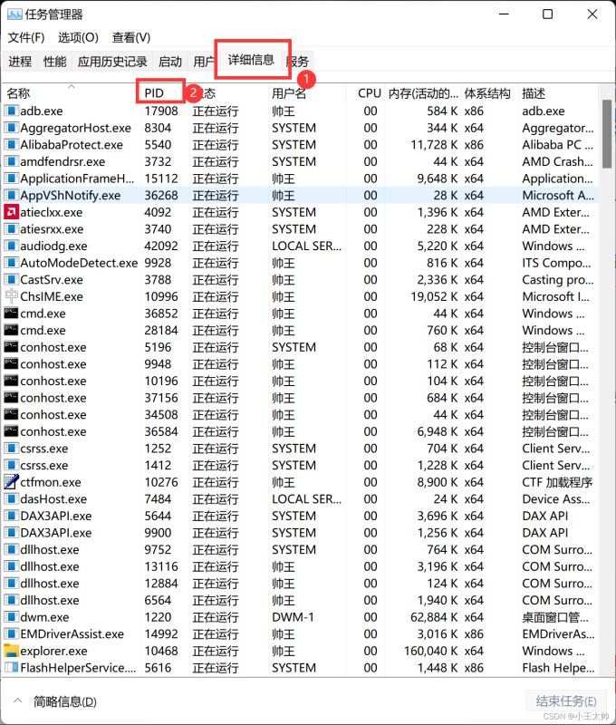 找到詳細信息這一欄,然后在PID這一列找我們之前記下的數字(19104、32364)