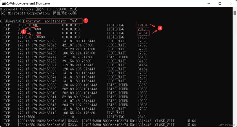 從上圖中可以看出,我當前的80端口有兩個程序在使用,有時候可能這個地方不止兩條程序在占用,可能有很多條占用80端口的信息,把后面的數字都記住(19104、32364),然后打開任務管理器,將所有占用的程序結束掉(第二列數字冒號后面的才是端口號)