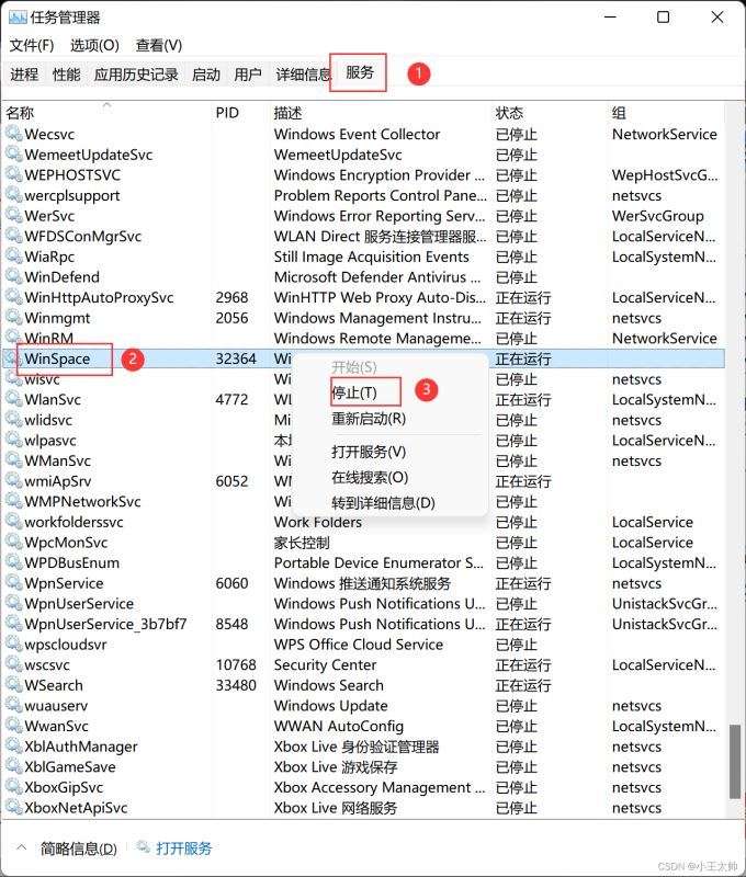 在服務欄中找到winspace這一列,然后右擊,點擊停止即可