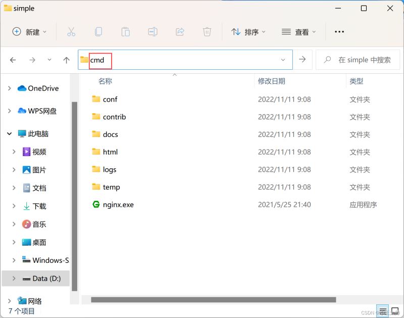 1.在nginx.exe的文件目錄下輸入cmd,然后回車,然后會彈出一個以該文件目錄下為開頭的命令提示符窗口,然后最小化該窗口(不要關閉,關閉之后很有可能會導致nginx.exe無法正常運行)