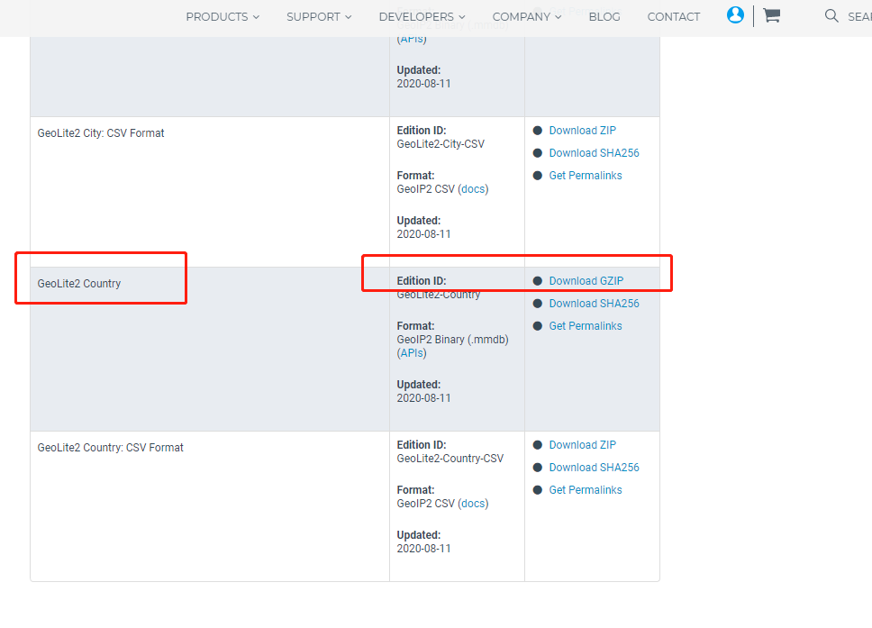 選擇 GeoLite2 Country,點擊 Download GZIP 下載即可: