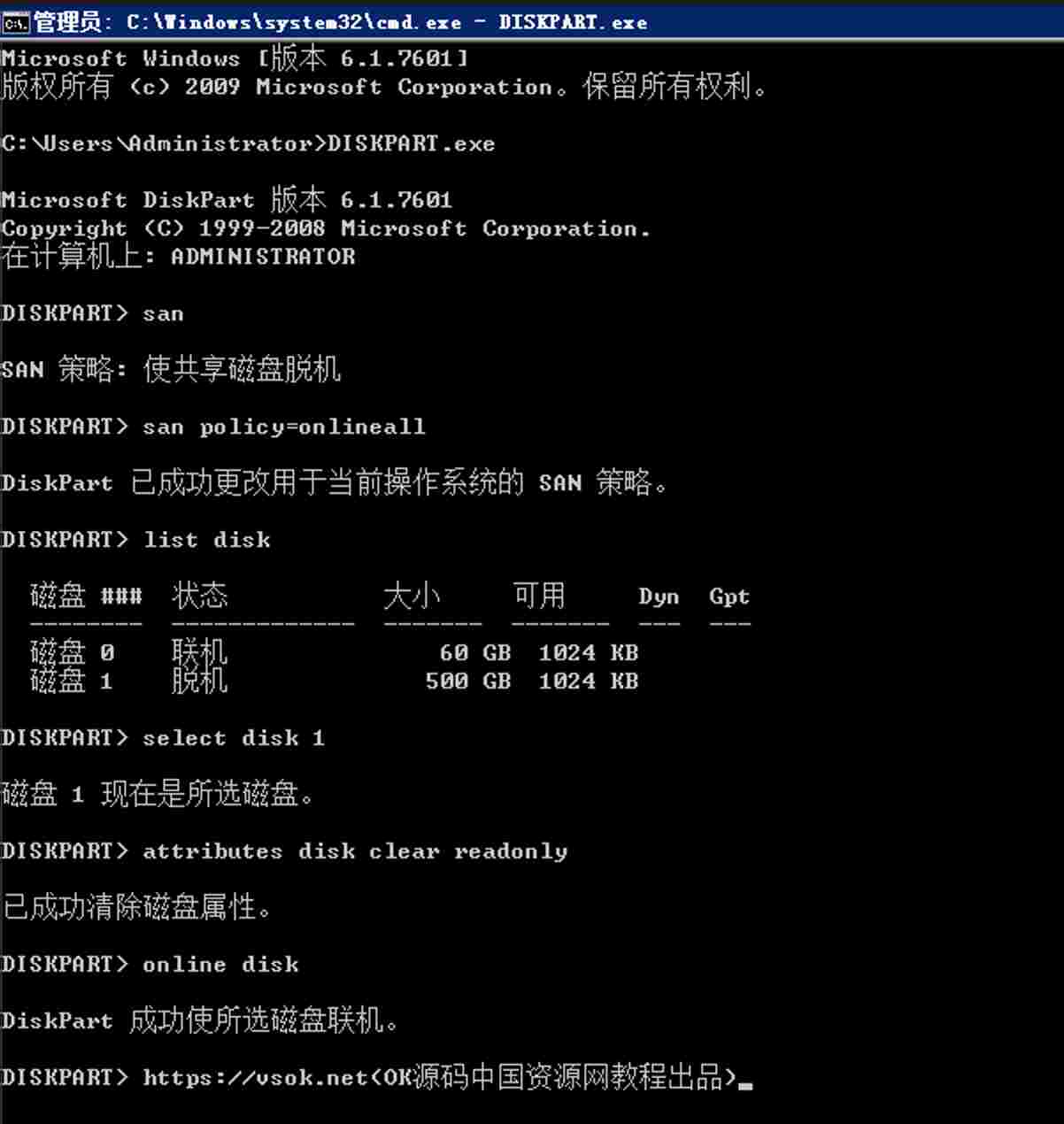 1.開始-運行:cmd2.輸入:DISKPART.exe3.DISKPART> san4.DISKPART> san policy=onlineall5.DISKPART> list disk6.DISKPART> select disk 17.DISKPART> attributes disk clear readonly8.DISKPART> online disk