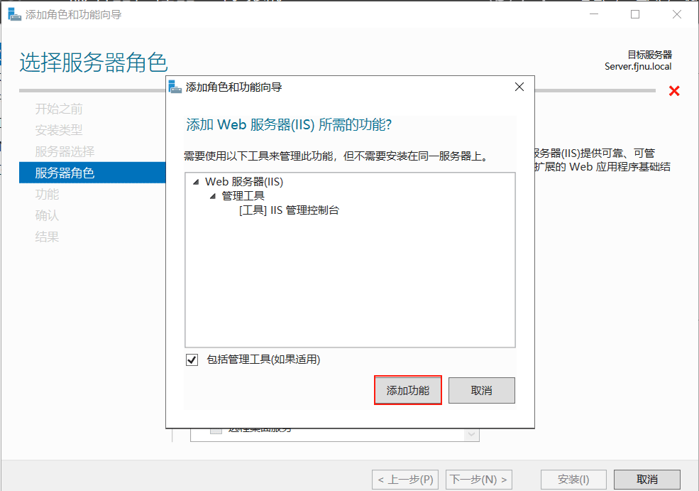 4)進入【服務器角色】頁面,點擊Web服務器(IIS),在彈出的對話框點擊【添加功能】。