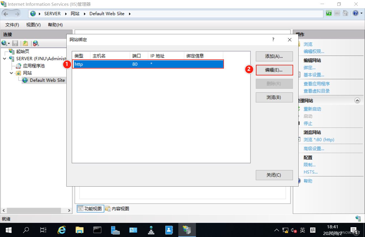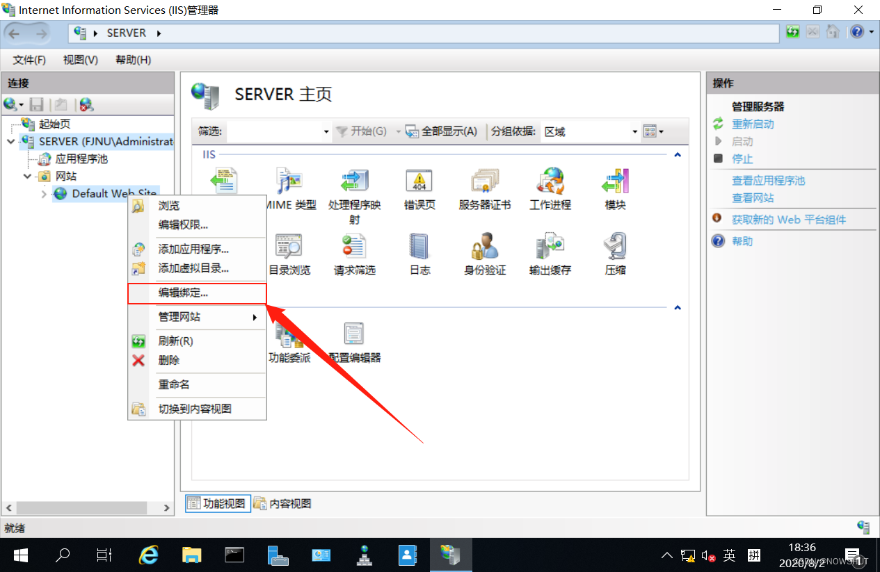 (2)在左邊連接欄中,展開左側的內容,找到【Default Web Site】,右鍵選擇【編輯綁定…】。