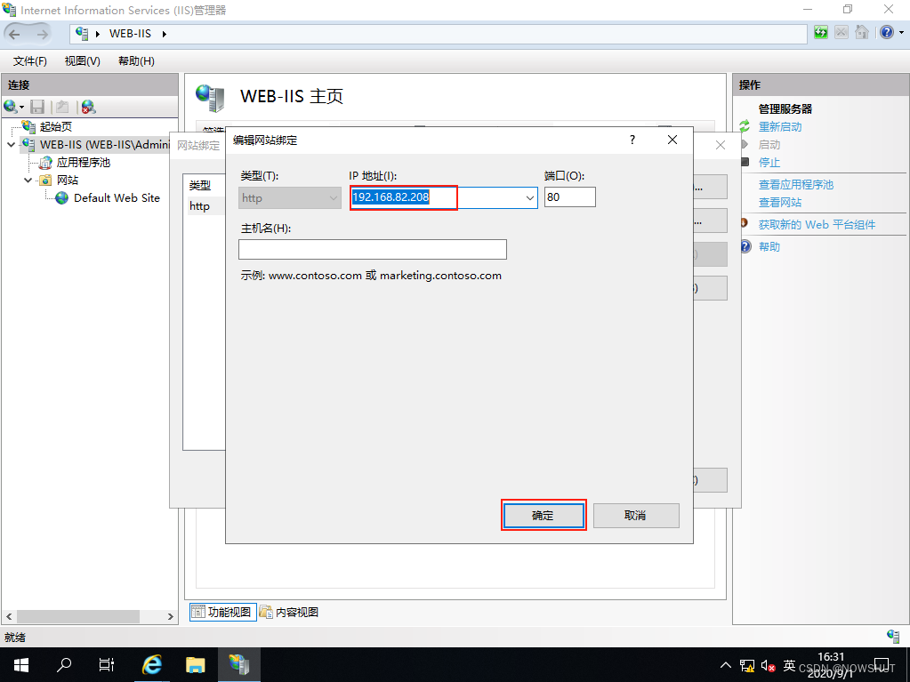 (5)打開【編輯網站綁定】,將IP地址指定為192.168.82.208,點擊【確定】。