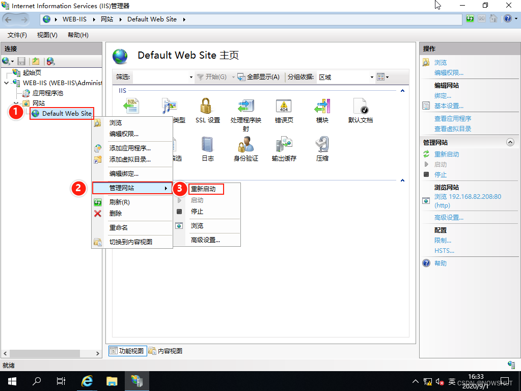 (6)重新啟動網站,對【Default Web Site】點擊鼠標右鍵,選擇【管理網站】,然后選擇【重新啟動】