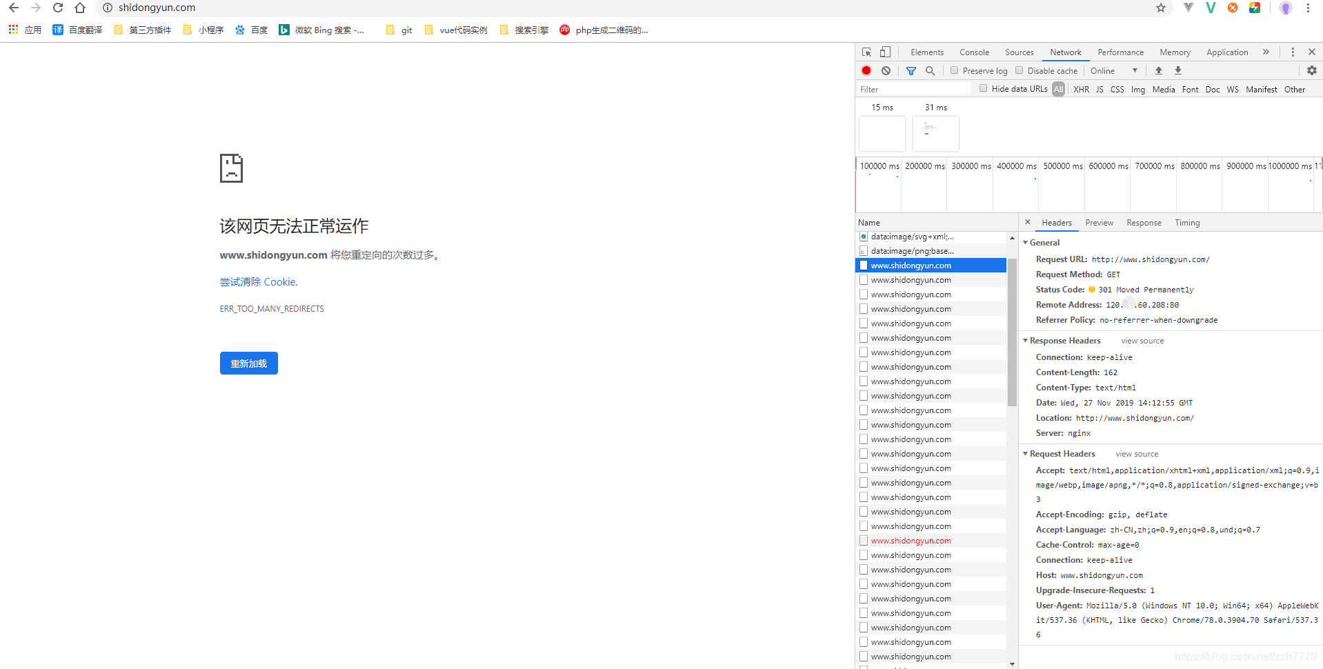 server { listen 80; server_name www.shidongyun.com shidongyun.com; #charset koi8-r; #access_log logs/host.access.log main; root '/data/wwwroot/shidong'; location / {rewrite ^/(.*) http://www.shidongyun.com/$1 permanent;index index.html index.htm index.php l.php;try_files $uri $uri/ /index.php?$query_string; autoindex off; }解決方案1,把service下面的service_name 做正確的修改,刪除www.shidongyun.com這個要重寫的域名。