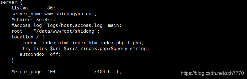 server { listen 80; server_name shidongyun.com; #charset koi8-r; #access_log logs/host.access.log main; root '/data/wwwroot/shidong'; location / {index index.html index.htm index.php l.php;rewrite ^/(.*) http://www.shidongyun.com/$1 permanent;try_files $uri $uri/ /index.php?$query_string; autoindex off; } 省略多余的部分.....只需要看rewrite跟service_name即可}server { listen 80; server_name www.shidongyun.com; #charset koi8-r; #access_log logs/host.access.log main; root '/data/wwwroot/shidong'; location / {index index.html index.htm index.php l.php;try_files $uri $uri/ /index.php?$query_string; autoindex off; }省略多余的部分.....只需要看service_name即可。root設(shè)置項目路徑。 }重啟nginx服務(wù)器1, /etc/init.d/nginx restart