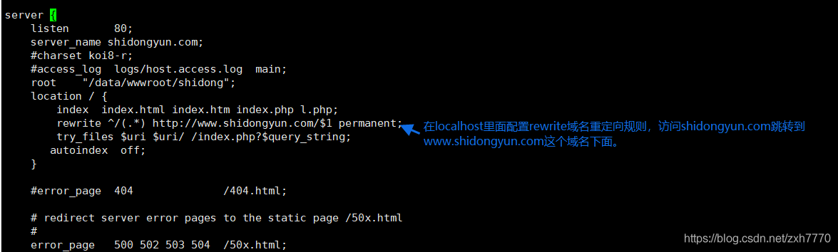 因為公司要求訪問 shidongyun.com的時候瀏覽器會自動跳轉(zhuǎn)到www.shidong.com下面,專業(yè)術(shù)語叫“301跳轉(zhuǎn)”百度了一番,nginx配置規(guī)則,用rewrite還有return進(jìn)行重寫301跳轉(zhuǎn)。我這里用的是rewrite。