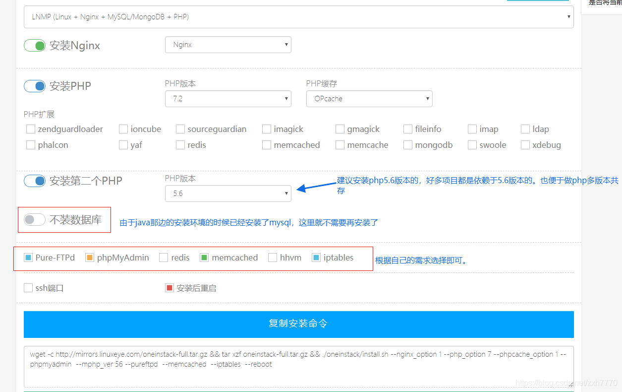 [root@iZm5e8nyz28v9zr7lhb7moZ install]# wget -c http://mirrors.linuxeye.com/oneinstack-full.tar.gz && tar xzf oneinstack-full.tar.gz && ./oneinstack/install.sh --nginx_option 1 --php_option 7 --phpcache_option 1 --phpmyadmin --mphp_ver 56 --pureftpd --memcached --iptables --reboot