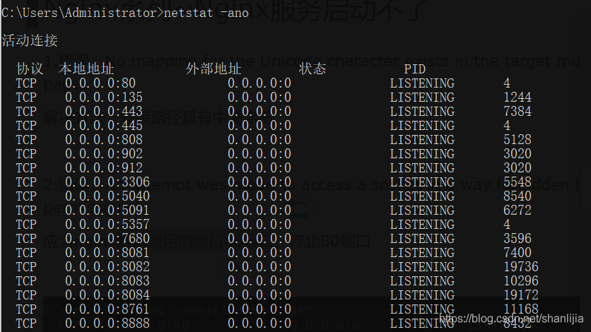 到此這篇關(guān)于Nginx啟動不了原因解決(端口占用)的文章就介紹到這了,更多相關(guān)Nginx啟動不了內(nèi)容請搜索好吧啦網(wǎng)以前的文章或繼續(xù)瀏覽下面的相關(guān)文章希望大家以后多多支持好吧啦網(wǎng)!