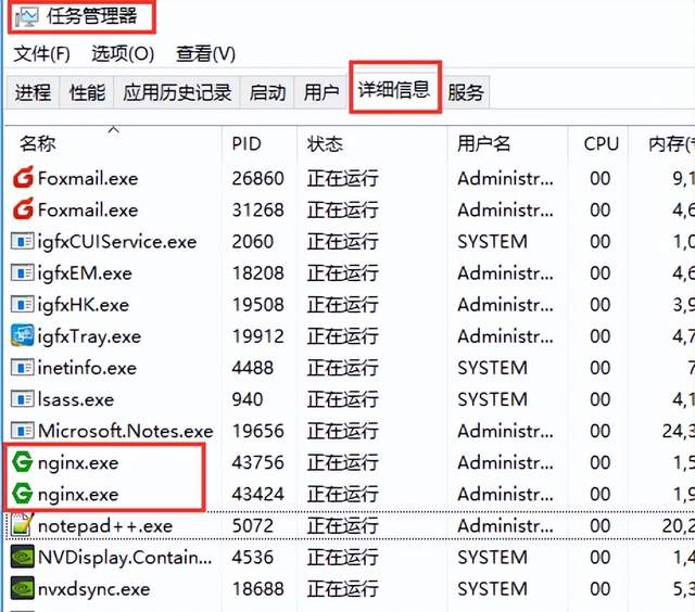 打開任務(wù)管理器在進程中看不到nginx.exe的進程(雙擊nginx.exe時會顯示在這里),需要打開詳細信息里面能看到隱藏的nginx.exe進程