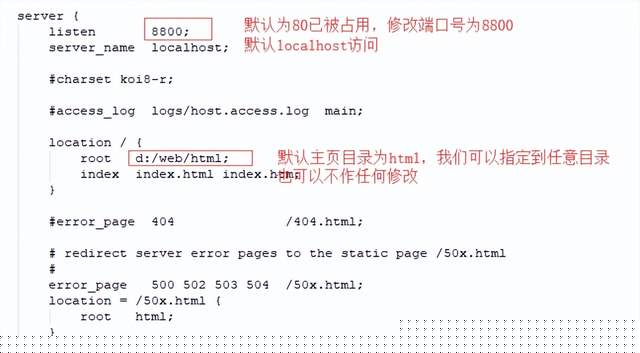 在conf目錄下找到nginx.conf使用txt文本打開即可,找到server這個節(jié)點,修改端口號,如果有需求可以修改主頁目錄沒有就不用修改