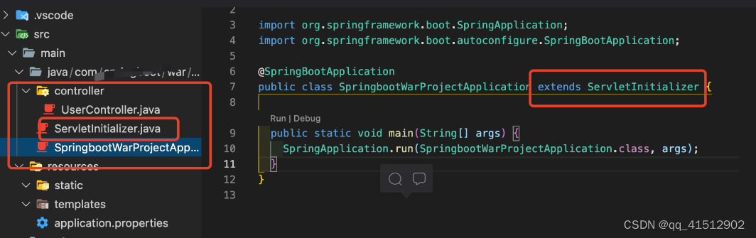 <dependency> <groupId>org.springframework.boot</groupId> <artifactId>spring-boot-starter-web</artifactId> <!-- 移除嵌入式tomcat插件 --> <exclusions><exclusion> <groupId>org.springframework.boot</groupId> <artifactId>spring-boot-starter-tomcat</artifactId></exclusion> </exclusions></dependency><!-- 添加servlet-api依賴 --><dependency> <groupId>javax.servlet</groupId> <artifactId>javax.servlet-api</artifactId> <version>3.1.0</version> <scope>provided</scope></dependency>(2)SpringBoot啟動(dòng)類,必須繼承一個(gè)SpringBootServletInitializer,然后重寫configure方法,目的是為當(dāng)前這個(gè)SpringBoot啟動(dòng)類構(gòu)建新資源。我這里項(xiàng)目創(chuàng)建的時(shí)候生成了一個(gè)ServletInitializer,所以直接繼承ServletInitializer即可。如果你的項(xiàng)目沒有ServletInitializer這個(gè)類,則手動(dòng)繼承。