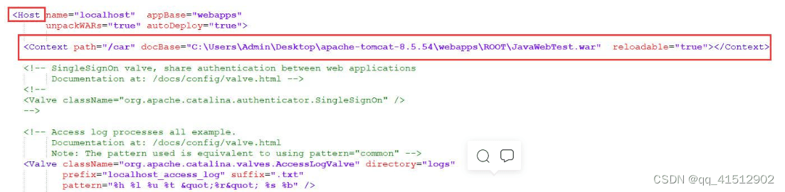 //<Context path='/' docBase='你項(xiàng)目的地址' reloadable='true'/><Context path='/car' docBase='C:\Users\Admin\Desktop\apache-tomcat-8.5.54\webapps\ROOT\JavaWebTest.war' reloadable='true'></Context>