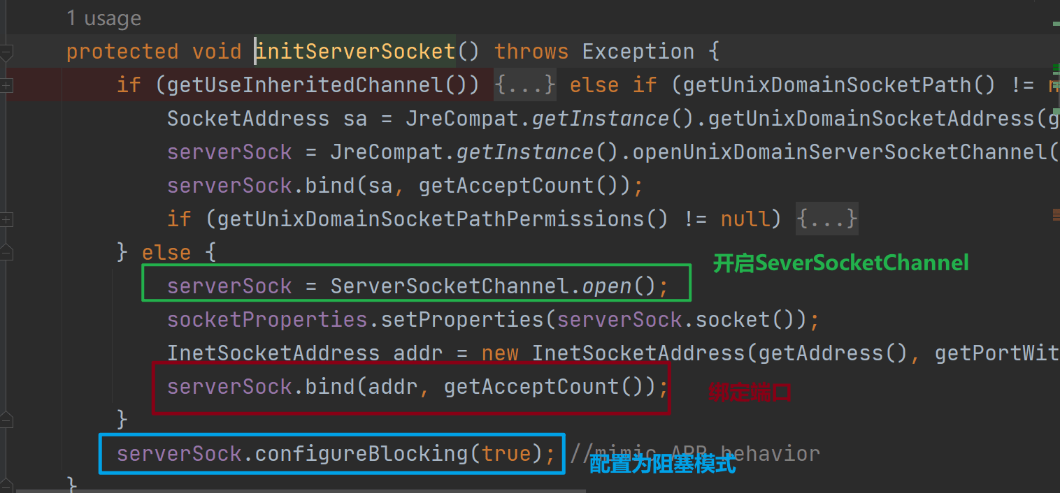 Endpoint:tomcat中沒有這個接口,只有AbstractEndpoint,它負責啟動線程來監聽服務器端口,并且在接受到數據后交給Processor處理Processor:Processor讀取到客戶端請求后按照請求地址映射到具體的容器進行處理,這個過程請求映射,Processor實現請求映射依賴于Mapper對象,在容器發生注冊和注銷的時候,MapperListener會監聽到對應的事件,從而來變更Mapper中維護的請求映射信息。ProtocolHandler:協議處理器,針對不同的IO方式(NIO,BIO等)和不同的協議(Http,AJP)具備不同的實現,ProtocolHandler包含一個Endpoint來開啟端口監聽,并且包含一個Processor用于按照協議讀取數據并將請求交給容器處理。Acceptor:Acceptor實現了Runnable接口,可以作為一個線程啟動,使用Socket API監聽指定端口,用于接收用戶請求。Poller:主要用于監測注冊在原始 scoket 上的事件是否發生,Acceptor接受到請求后,會注冊到Poller的隊列中。二丶NioEndpoint 初始化ServerSocketChannelspringboot內嵌tomcat,一般默認使用NioEndpoint,在NioEndpoint#start方法中,會觸發NioEndpoint#bind