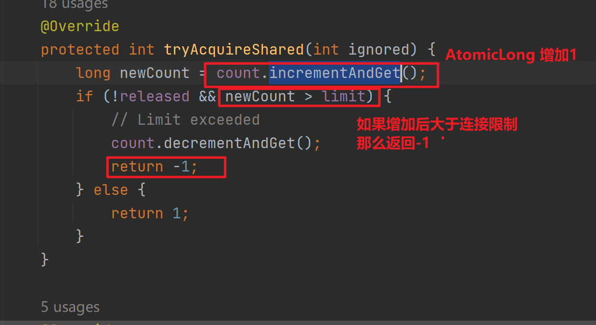 LimitLatch 內部持有一個AbstractQueuedSynchronizer,限制連接數將調用其acquireSharedInterruptibly(1),然后會調用到AQS的tryAcquireShared,其內部使用AtomicLong來進行連接的計數。