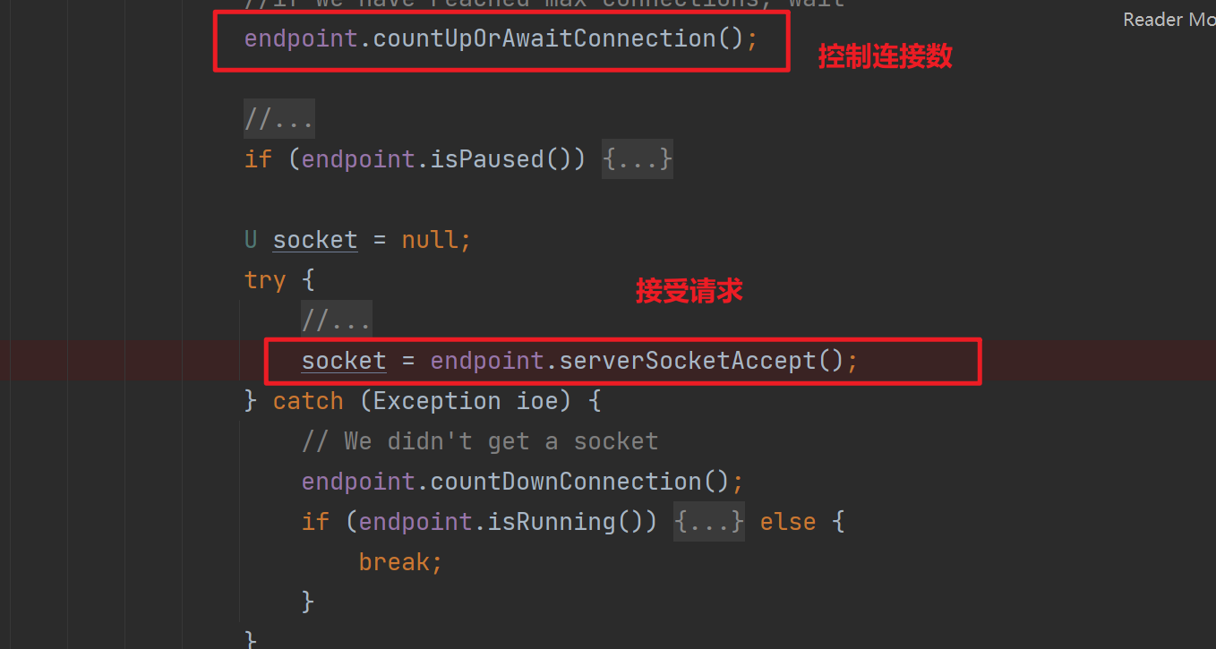 其內部使用LimitLatch#countUpOrAwait方法限制連接數,如果連接數達到了上限,那將掛起當前線程,也就是掛起Acceptor線程,從而導致無法有更多的請求連接上來,最大連接數默認為8*1024。