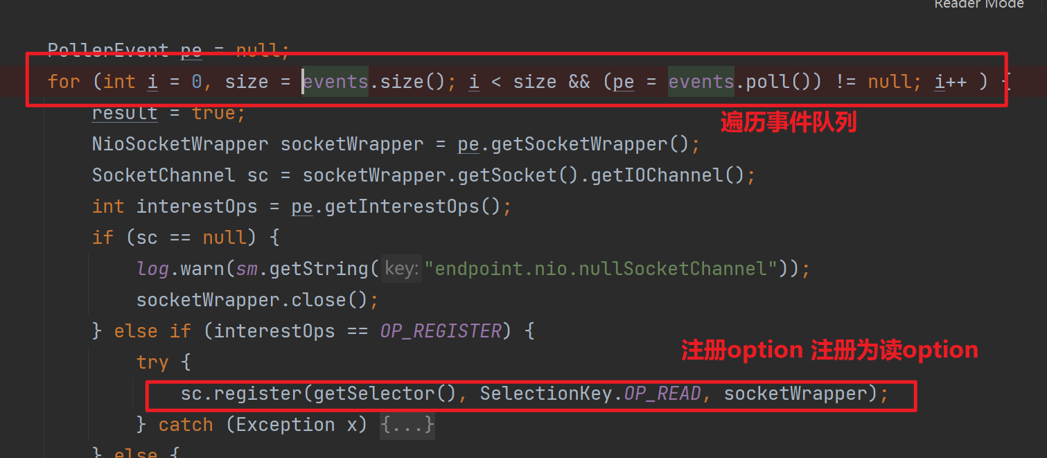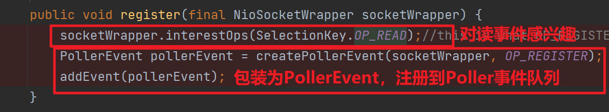 在Acceptor線程接收到SocketChannel后,會調用Poller#register方法進行注冊,Acceptor只負責接受請求,請求后續的處理由Poller線程負責