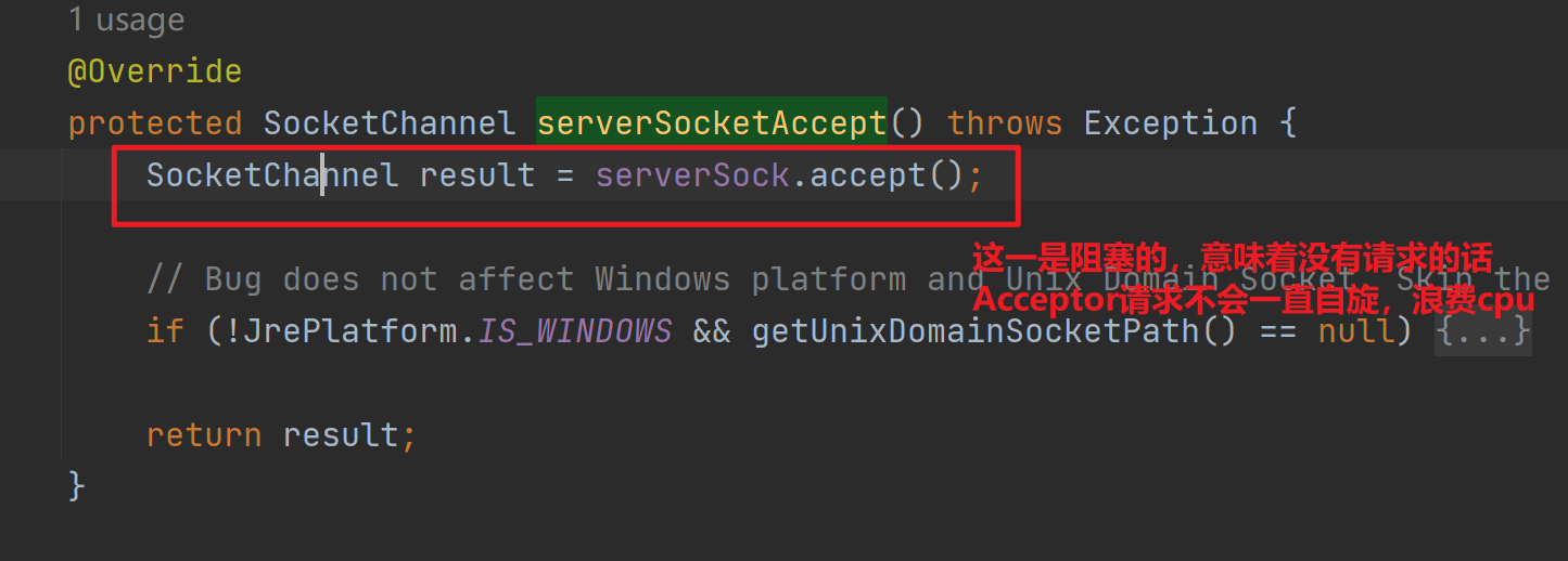 由于NioEndpoint前面調用了ServerSocketChannel#configureBlocking(true),所以serverSock#accept,在沒有連接上來時,不會立馬返回null,而是阻塞直到連接來到。