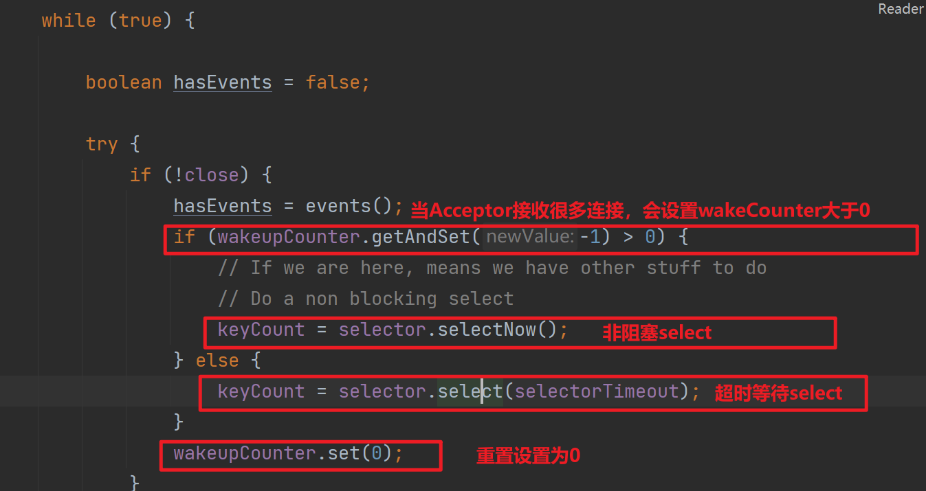 也就說Acceptor接受到請求越多,wakeupCounter越大,越會讓Poller調用selector.selectNow()減少阻塞,從而讓Poller更快的檢查事件是否就緒,從而讓請求更及時的被處理。