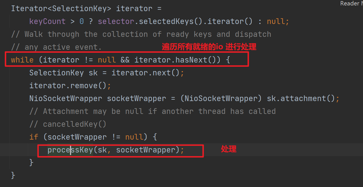 通過Selector獲取獲取當前就緒的IO,keyCount記錄就緒數目。