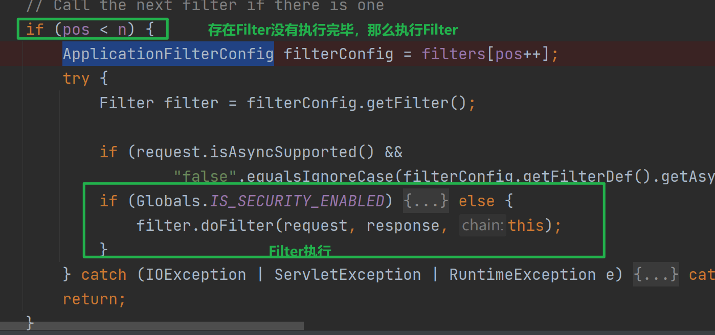 ApplicationFilterChain包含多個ApplicationFilterConfig,使用數組和pos屬性記錄當前執行到第幾個Filter