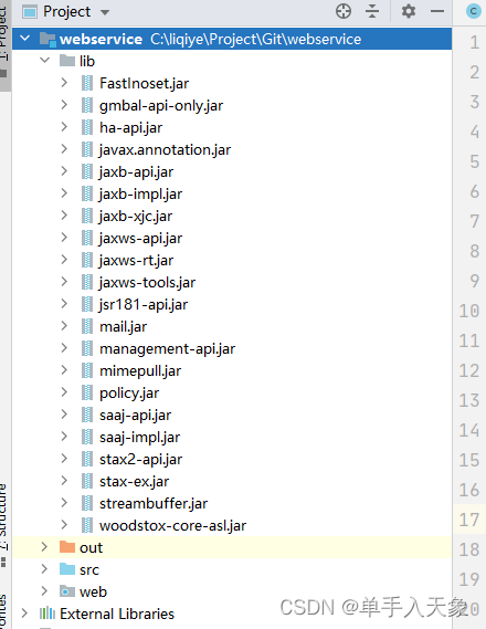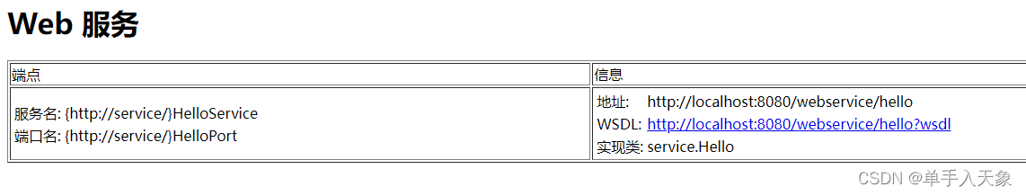 package service.test;import service.Hello;import javax.xml.ws.Endpoint;/** * @author liqiye * @description 用來測試運(yùn)行 web service 服務(wù)的 * @date 2023/2/21 */public class TestServer { public static void main(String[] args) {Object implementor = new Hello();// 這個(gè)地址在這里測試用什么都可以,只是我想要?jiǎng)偤脤?duì)上等下用tomcat部署的連接String address = 'http://localhost:8080/webservice/hello';Endpoint.publish(address, implementor); }}到這里,web service 項(xiàng)目的服務(wù)端就開發(fā)好了!