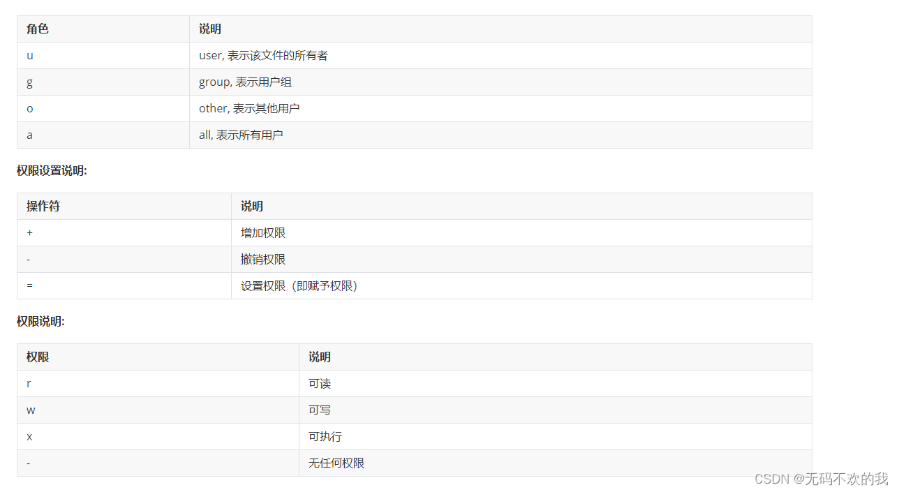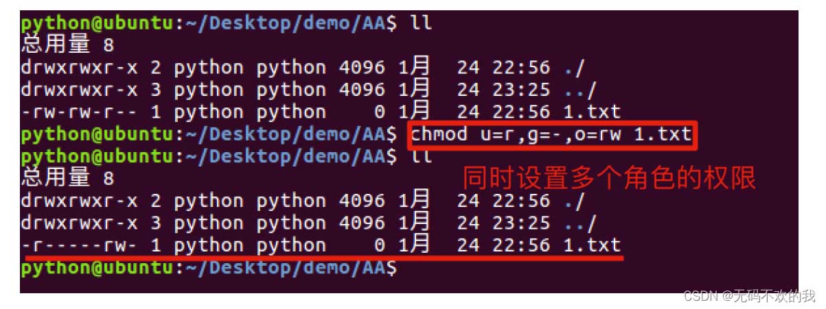 2.2 chmod 字母法的使用格式:chmod u/g/o/a+/-/=rwx 文件名