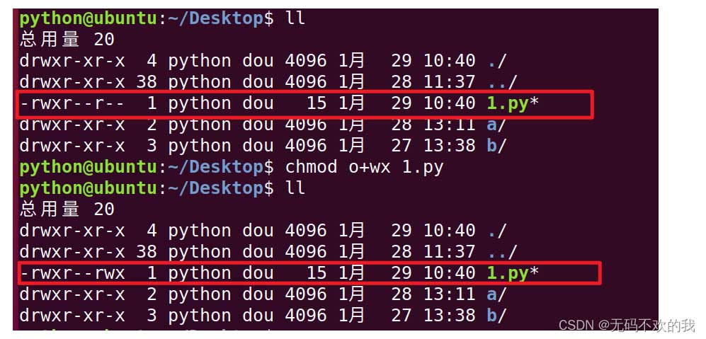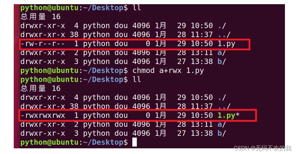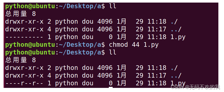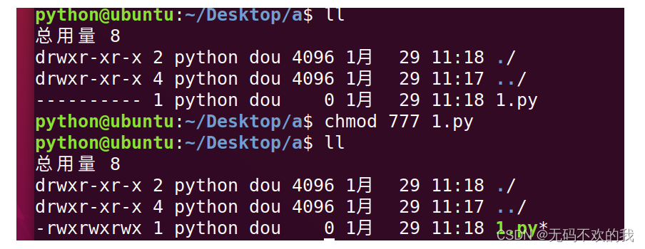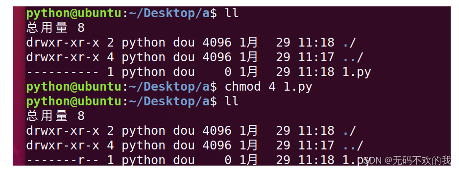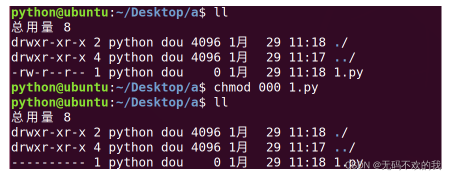 chmod命令數(shù)字法應(yīng)用舉例:將1.py的所有用戶(即用戶,用戶組,其它用戶)權(quán)限全部取消